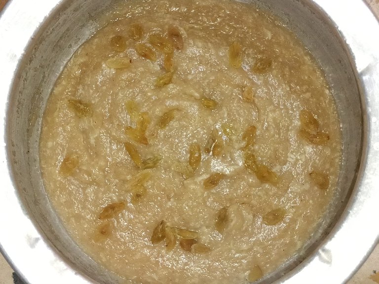 So now you can see how much it has thickened. Now I took it off the stove and finally added raisins on top of it. This is my recipe.