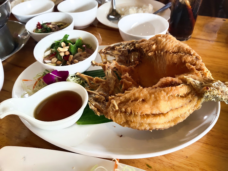 - ปลากะพงทอดน้ำปลา: ราชาของโต๊ะอาหารตัวจริงเสียงจริง! หนังปลาทอดมาจนกรอบกริ๊บ แต่เนื้อข้างในยังนุ่มฉ่ำหวาน ลาดด้วยน้ำปลารสเลิศหอมกรุ่นที่แค่ได้กลิ่นก็แทบคลั่งแล้วครับ